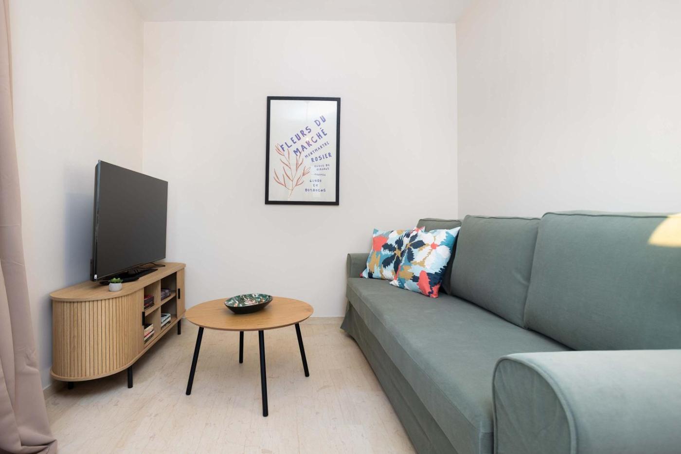 One-Bedroom Apartment with Balcony and City View. This apartment is comprised of 1 living room, 1 separate bedroom and 1 bathroom with a hairdryer and free toiletries. The well-equipped kitchen features a stovetop, a refrigerator, kitchenware and an oven. The air-conditioned apartment offers a TV, a washing machine, a tea and coffee maker, a wardrobe as well as sea views. The unit offers 2 beds.