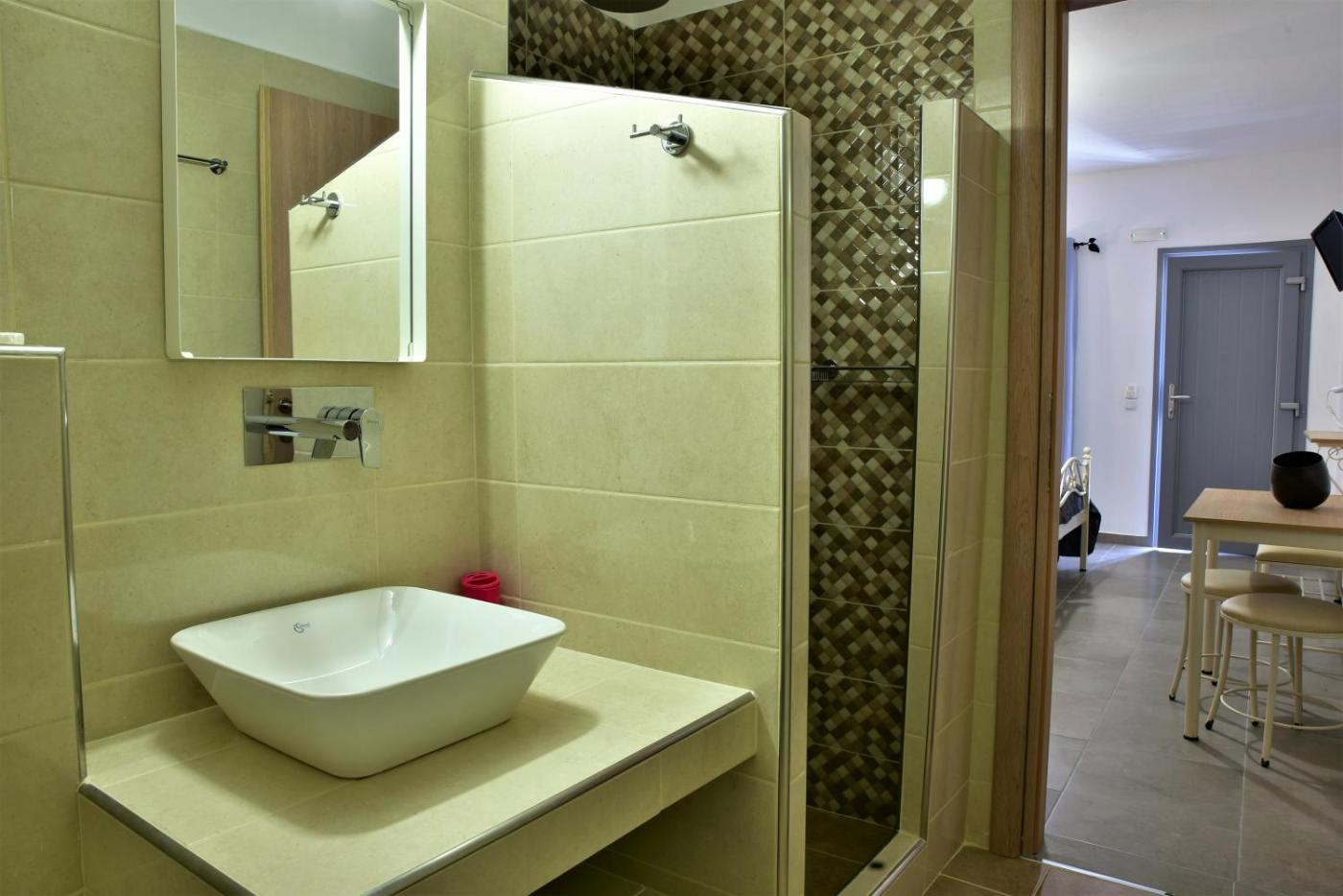 The traditionally decorated studios and apartments have a balcony or terrace. They are open plan in style, featuring a kitchenette with fridge and dining table. Equipment includes free Wi-Fi and a TV.